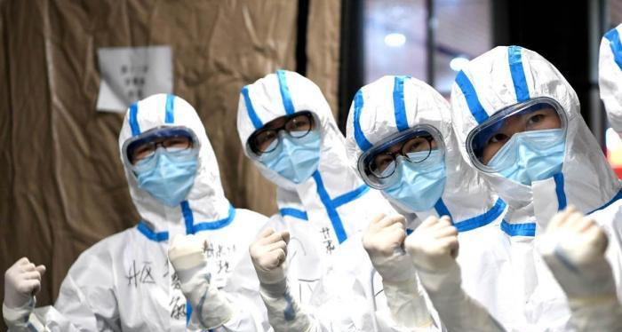 圖為武漢醫(yī)護(hù)人員在進(jìn)入病區(qū)前加油鼓勁 安源 攝