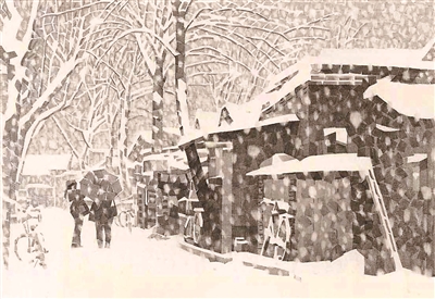 休息日,大雪天,況晗背著畫具出門作畫。濕式水彩畫,講究水色淋漓,是用排筆將清水洇濕畫紙然后作畫。一幅寫生未成,畫筆已然結(jié)冰。況晗的家鄉(xiāng)氣候濕潤(rùn),墻縫里面生的是青苔。北京的氣候干燥,墻縫里面積存的是數(shù)百年的塵土。家鄉(xiāng)村野的色調(diào)是青綠,京城胡同的色調(diào)是灰白,于是況晗改用寬線條鉛筆畫來(lái)寫意胡同。