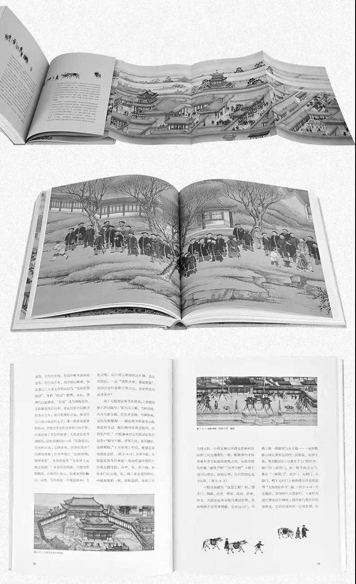 “左圖右史”的表述方式,其優(yōu)勢(shì)在于讀者一邊“索象于圖”,一邊“索理于書(shū)”,使“象”“理”緊密結(jié)合,實(shí)現(xiàn)以圖證史、以圖補(bǔ)史與圖文互證,具有“人亦易為學(xué),學(xué)亦易為功”的功效?!妒耸兰o(jì)京華盛景圖》一書(shū),以精心繪制、精準(zhǔn)選擇、精美印制的“象”,和旁征博引、嚴(yán)謹(jǐn)考訂、精辟闡釋的“理”,步步交融互證。由于有圖,彌補(bǔ)了“僅以文字傳之而不能曲達(dá)其委折纖悉之致”的缺陷;由于有文,使讀者“見(jiàn)其形”且“聞其聲”,“見(jiàn)其人”且“聞其語(yǔ)”,實(shí)現(xiàn)了“兩美合并,二妙兼全”的融合。