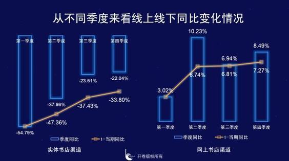 從不同類型書店來看,一二線城市以及超大書城類同比下滑嚴重,全年同比降幅均在35%以上,從不同季度來看,不同類型書城和整個實體店渠道趨勢變化類似。