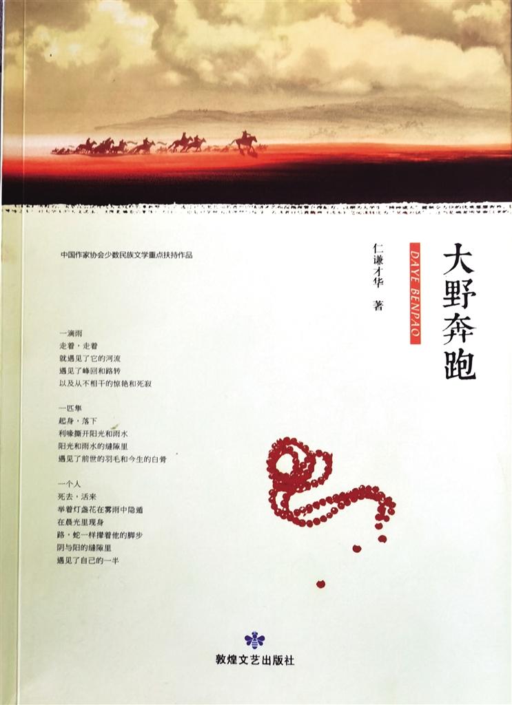 詩歌集《大野奔跑》是仁謙才華近年來的傾心之作,該作品由敦煌文藝出版社出版發(fā)行。詩集由作家張存學(xué)作序,收錄了仁謙才華4年來發(fā)表在《詩刊》等刊物上130余首詩歌。張存學(xué)在序中這樣評(píng)價(jià):“語言,既是阻礙,也是抵達(dá)之路,這個(gè)緊張度也是考驗(yàn)一個(gè)寫作者的坎,這個(gè)坎過得好一些就能夠把握住詩抵達(dá)生命的本真,把握不好,就會(huì)在空泛的意象中游走。仁謙才華在這方面的蛻變,從他這本詩集能夠看出,他由早期的直抒胸意、向外張揚(yáng)變得安靜起來,變得從容而多思,也變得獨(dú)立而內(nèi)在……”