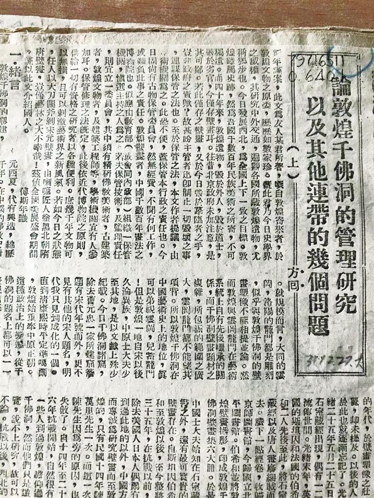 向達(dá)先生曾先后兩次考察敦煌,第一次是在1942年4月,中央研究院組織西北史地考察團(tuán),其中的歷史考古組由中央研究院歷史語言研究所、中央博物院與北京大學(xué)聯(lián)合組成,向達(dá)代表北大并擔(dān)任歷史考古組主任。在這次考察中,他在給友人、南京博物院院長曾昭燏的信件中講述了他第一次看到敦煌莫高窟時的激動心情,同時對于莫高窟受到自然和人為的毀壞而感到痛心。他用三天的時間寫成了一萬多字、此后對敦煌學(xué)有重大影響的《論敦煌千佛洞的管理研究以及其他連帶的幾個問題》,署名“方回”寄給了傅斯年,后經(jīng)傅斯年推薦,在重慶的《大公報(bào)》連載發(fā)表,文中提出將千佛洞收歸國有,由學(xué)術(shù)機(jī)構(gòu)進(jìn)行管理,開展研究工作等建議。此文發(fā)表,一石激起千層浪,直接推動國立敦煌藝術(shù)研究所于1944年成立。研究所成立后,常書鴻任所長。這也開啟了“敦煌學(xué)”長流不息的淵源。樊錦詩后來也撰文稱:“他(向達(dá))文章中提出的關(guān)于保護(hù)和管理的具體建議,被后來成立的敦煌藝術(shù)研究所采納,成為敦煌石窟保護(hù)和管理的參照。向達(dá)提出的‘不可輕易剝離壁畫’的主張,也是敦煌研究院幾十年來在壁畫保護(hù)和管理中一直恪守的紀(jì)律和原則。”