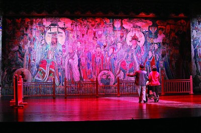 《永樂(lè)宮紀(jì)事》創(chuàng)造性地將蒲劇、歌劇、舞劇、話劇、音樂(lè)劇等多種藝術(shù)形式有機(jī)結(jié)合、融為一體,在充分利用地域文化元素的同時(shí),還將珍貴的永樂(lè)宮壁畫與現(xiàn)代聲光電等舞臺(tái)技術(shù)有機(jī)結(jié)合,營(yíng)造出絢麗多彩的舞臺(tái)效果。