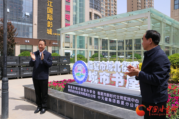 甘肅省委宣傳部副部長(zhǎng)、省新聞出版局(版權(quán)局)局長(zhǎng)王成勇(左)為臨夏市城北街道城市書屋揭牌