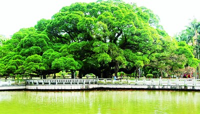 擁有古樹的城市就是擁有歷史的城市。福州古榕遍布,四季常青,是城市、市民生活與樹木的完美結(jié)合,是風(fēng)景的自然生長,是歷史根深葉茂地屹立。福州古榕以樹齡長、歷史久、數(shù)量眾而著稱。見證福州城市史的,當(dāng)首推鼓山國家森林公園、八一水庫旁,福州無人不知的已近千歲,被譽為福州榕樹王的古榕。相傳,這棵古榕是張伯玉所栽植的兩棵樹苖,光陰荏苒,同氣相求,如今兩棵榕樹相互糾結(jié)、勾連、纏繞、親密,已無分彼此。其冠幅達(dá)1300米,可容納千人在樹下談古論今,聊天遮陰。遠(yuǎn)望,似綠色陵巖;近看,知其為榕也,密密的枝葉把近午的陽光切割成碎花點,散落、閃亮在榕樹下的草坪和地衣上。初訪者或為訝異:偌大一棵古榕卻不見氣根,知榕者會告訴你,這是一株碩大、古老而不生氣根的細(xì)葉榕。因其冠幅日益長大,為了支撐沉重的樹冠、預(yù)防主干折損,便制作了若干石柱,砥柱其間。古榕下有湖塘,錦鯉游泳,不時生出紅色漣漪。旁有一碑,上刻:榕蔭照水波心漾,觀魚猶勝花間行。