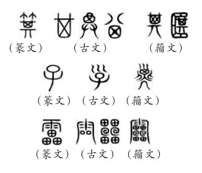 (五)所謂“9353”,指的是《說文》所收全部正篆,即《說文》分析解釋的全部字。《說文》收字以篆文為“正”,作為標準字體,這就是許慎所說的“今敘篆文,合以古籀”的收字原則。“今敘篆文”,就是以篆文(小篆)作為標準正字,同時也會根據(jù)需要收列部分古文和籀文?!墩f文》所謂“古文”主要是孔子壁中書和民間所獻古文經(jīng)所用的文字,“籀文”即傳為西周晚期太史籀所編字書《史籀篇》上的文字。從《說文》來看,收入的古文、籀文,主要是與篆文有明顯差異的字形。如篆文“箕”“子”“雷”下所收列的古文、籀文: