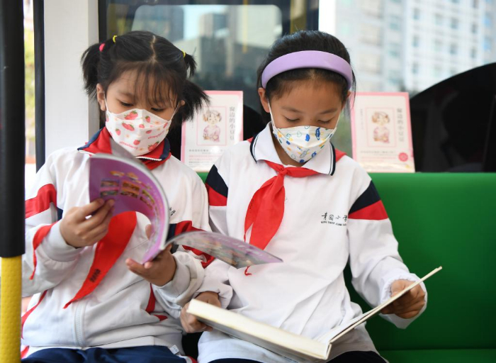 11月10日,學(xué)生在長(zhǎng)沙市青園友誼小學(xué)巴士圖書(shū)館內(nèi)閱讀。