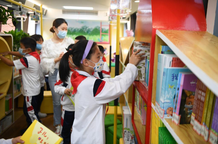 11月10日,學(xué)生在長(zhǎng)沙市青園友誼小學(xué)巴士圖書(shū)館內(nèi)歸還圖書(shū)。
