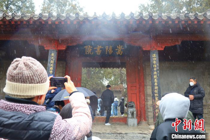 中新網(wǎng)鄭州2月23日電 (王迪)春雪依依,古柏森森,紅墻青瓦間傳出幾句儒家經(jīng)典的吟誦之聲……在22日的“寫意中國——探訪漢字起源”主題宣傳采訪中,記者探訪了河南登封市區(qū)北約二公里處嵩山南麓的嵩陽書院。是日清晨,登封忽降細(xì)雪,映襯得整個嵩陽書院愈發(fā)肅穆。美景難得,引得游人紛紛駐足欣賞,拍照留念。