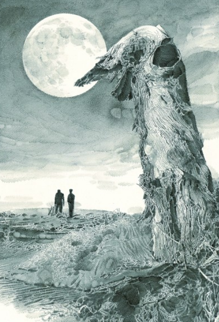 一輪滿月在大漠天空中懸浮著,兩個人行至遠(yuǎn)方的沙地,并肩好似在暢談著什么??窃凇蹲x者》2019年第五期的這幅插圖,出自魯迅美術(shù)學(xué)院教授李晨之手,他以寫實的素描手法為陳忠實的文章《毛烏素沙漠的月亮》配圖,畫面細(xì)膩而充滿想象空間。