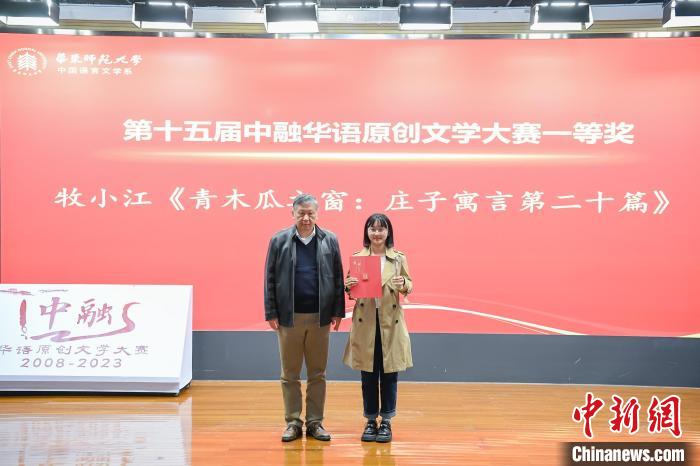 第十五屆中融華語(yǔ)原創(chuàng)文學(xué)大賽一等獎(jiǎng)獲得者朱禹同(筆名牧小江)從孫甘露手中接過(guò)獎(jiǎng)狀、獎(jiǎng)杯。(華東師范大學(xué)供圖)
