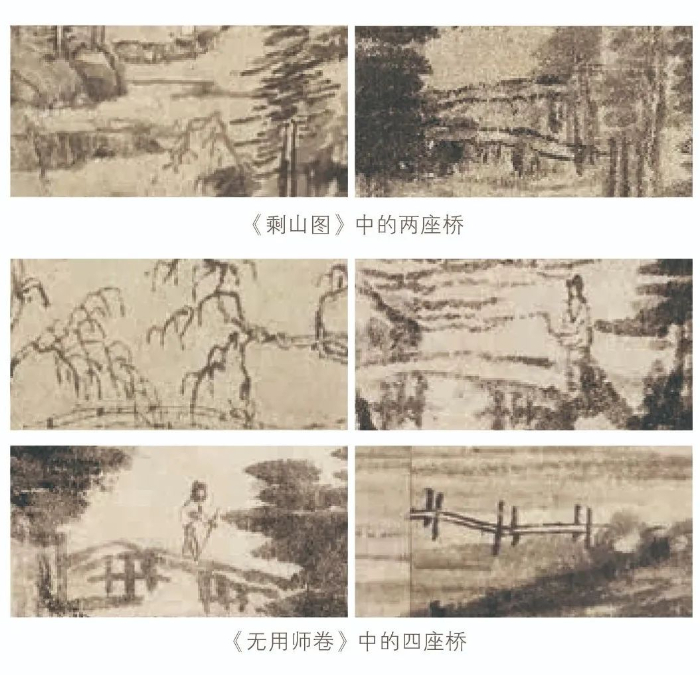 《富春山居圖》全卷共畫有六座橋,其中《剩山圖》上有兩座橋,《無(wú)用師卷》上有四座橋。讓我們先找到其中的一座橋,它在梁詩(shī)正書寫的“鑒定”開頭部分正下方。你有沒(méi)有發(fā)覺,這座橋最為特殊。