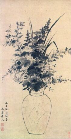 清初畫家王時(shí)敏的《端午景圖》《端陽墨花圖》,將艾草、蜀葵、柳條、石榴花等時(shí)令花草引入畫中,寄予驅(qū)邪納福的寓意。畫中所寫花草濃墨與淡墨相間,層次分明,體現(xiàn)出駕馭水墨的嫻熟技藝。值得一提的是,《端午景圖》中的瓷瓶為帶冰裂紋的豐肩斂腹瓶,這種將瓷器表面花紋如實(shí)描繪出來的現(xiàn)象,在古代花鳥畫中并不多見,由此可見畫家獨(dú)特的筆墨趣味。
