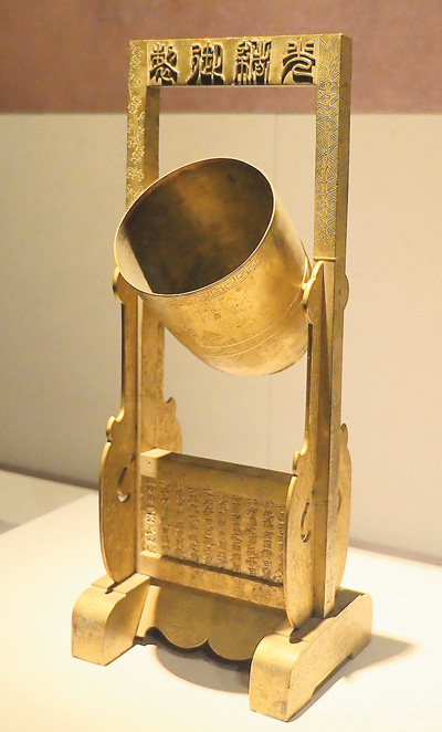 一件造型獨特的金色器物吸引了記者注意。達微佳介紹,這是故宮博物院藏清代銅鍍金欹器。欹器是一種傾斜易覆的盛水器,中空時,會向一側傾斜;注水一半時,能保持端正;水注滿時,會傾覆倒出,生動展現了儒家“不偏不倚,無過不及”的中庸之道。據文獻記載,孔子曾在魯桓公之廟觀欹器,并向學生講解它的道理。古時國君將欹器置于座右,作為修身之戒,因此又稱“宥坐之器”。