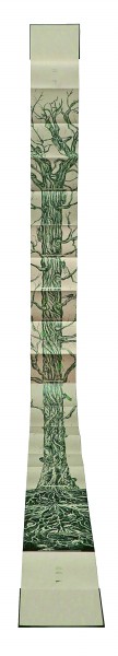 除了材料語(yǔ)言的拓展,展覽中的許多作品還展現(xiàn)出設(shè)計(jì)形式的創(chuàng)新與突破。如陳潔瑩的《蟬鳴樹語(yǔ)》聚焦了蟬絢爛而短暫的生命軌跡。書籍的裝幀方式采用經(jīng)折裝,當(dāng)書本徐徐展開,一棵參天古樹好似拔地而起,貫通全書首尾。由樹根處為起點(diǎn)向上閱讀直至樹冠,可見蟬從卵枝到若蟲,再經(jīng)歷脫殼變?yōu)槌上x的歷程。經(jīng)由巧妙的形式設(shè)計(jì),生命的輪回在書頁(yè)間流轉(zhuǎn),詮釋出動(dòng)人的自然之力。
