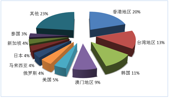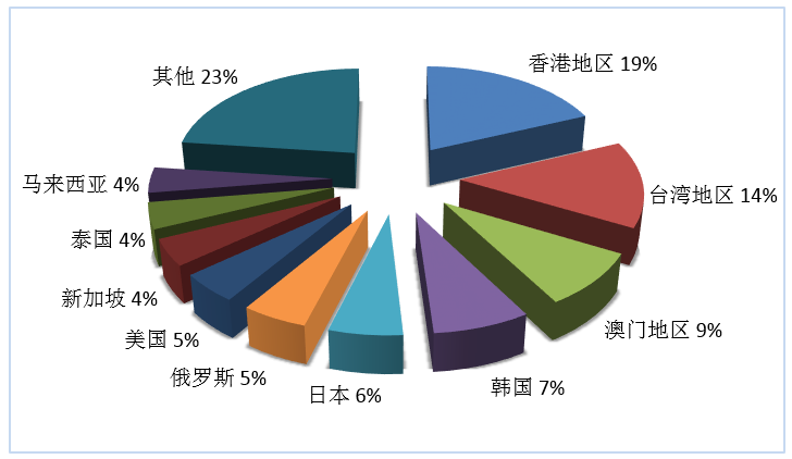 第三季度旅行社入境旅游接待人次排名前十位的客源地國(guó)家或地區(qū)由高到低依次為香港地區(qū)、臺(tái)灣地區(qū)、韓國(guó)、澳門地區(qū)、美國(guó)、俄羅斯、馬來(lái)西亞、日本、新加坡、泰國(guó)(見(jiàn)圖2)。