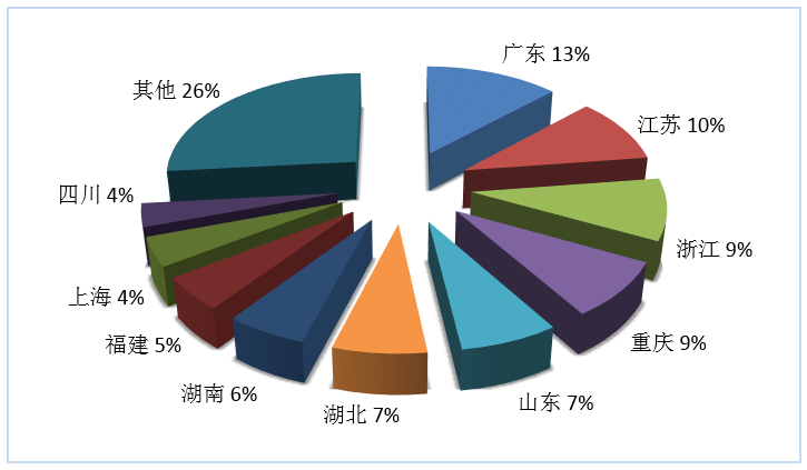 第三季度旅行社國(guó)內(nèi)旅游組織人次排名前十位的地區(qū)由高到低依次為廣東、江蘇、浙江、重慶、山東、湖北、湖南、福建、上海、四川(見(jiàn)圖3)。