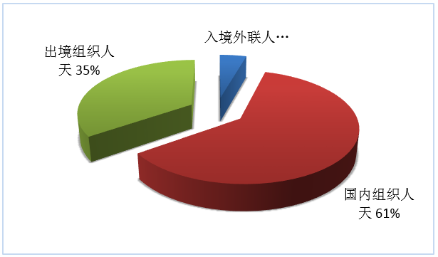 按照入境外聯(lián)人天、國(guó)內(nèi)組織人天、出境組織人天三項(xiàng)指標(biāo),入境旅游、國(guó)內(nèi)旅游、出境旅游市場(chǎng)人天所占份額依次為4%、61%、35%(見(jiàn)圖7)。