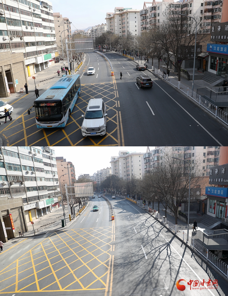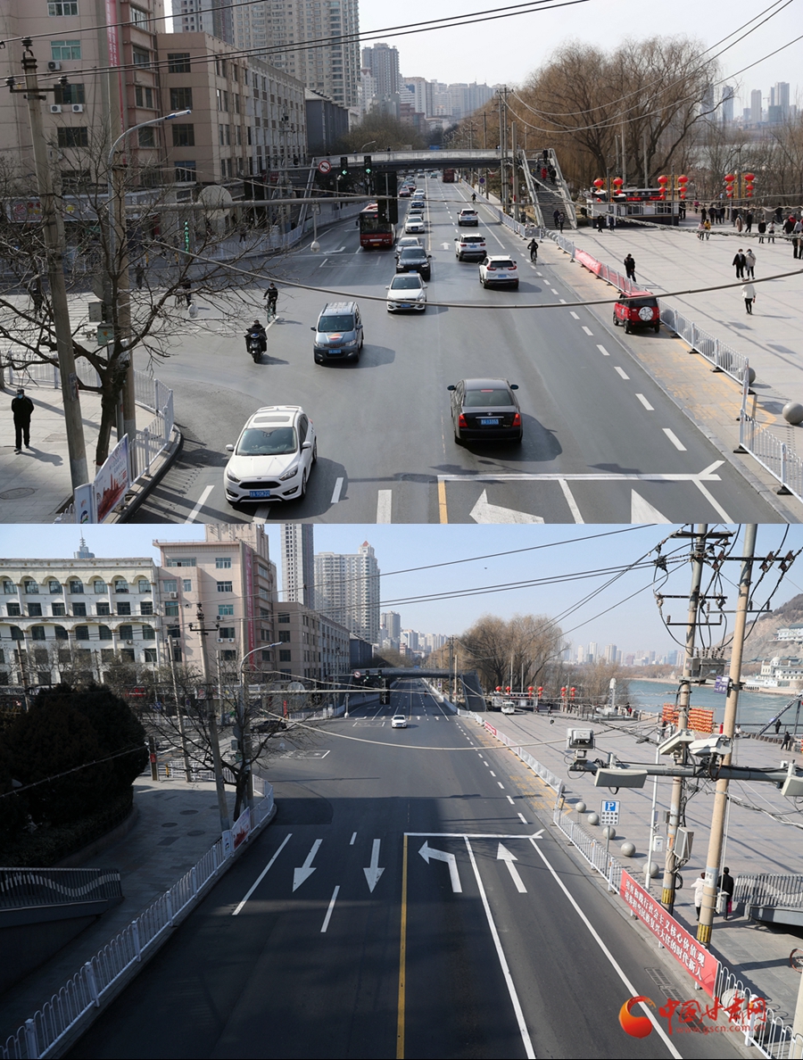 3月3日(圖上)與2月4日(圖下)從五泉山過(guò)街天橋俯拍的道路情況