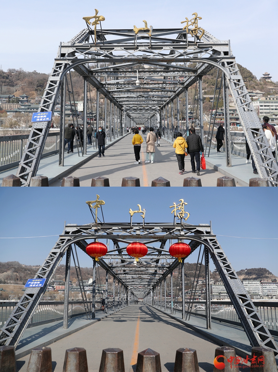 3月3日(圖上)與2月4日(圖下)拍攝的蘭州中山橋