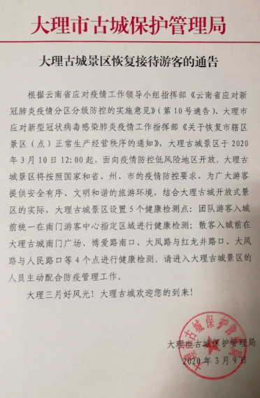 3月9日,云南省大理市古城保護管理局發(fā)出通告,宣布大理古城景區(qū)于2020年3月10日12:00起,面向疫情防控低風險地區(qū)開放。