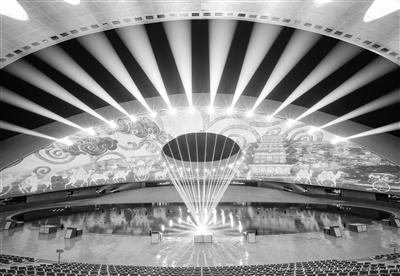 華夏文化展示中心分為展演區(qū)與展示區(qū)兩個(gè)部分,展示區(qū)為古鎮(zhèn)式商業(yè)街,目前已進(jìn)入收尾階段,展演區(qū)為大型激光水舞秀劇場(chǎng)——日月館,去年已試運(yùn)營(yíng),效果極佳。別名“黃河巨蛋”的日月館總用地面積為12000平方米,場(chǎng)館外形呈半橢圓形,由兩片獨(dú)立的頂棚覆蓋,場(chǎng)館高30米,寬約80米,內(nèi)設(shè)觀眾席位1450座。場(chǎng)館屋頂?shù)奶煅坶_口和場(chǎng)館地面體現(xiàn)了中國(guó)天圓地方的理念以及太陽和月亮的互相映襯。外立面采用了與當(dāng)?shù)貍鹘y(tǒng)屋頂瓦片相呼應(yīng)的獨(dú)特形狀,又像鳥兒折疊的翅膀和羽毛,極富活力和寓意。