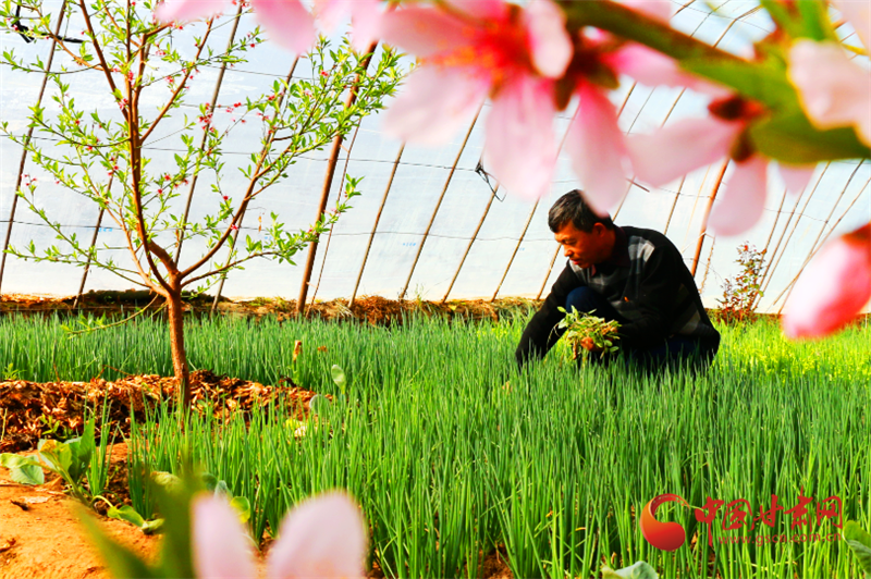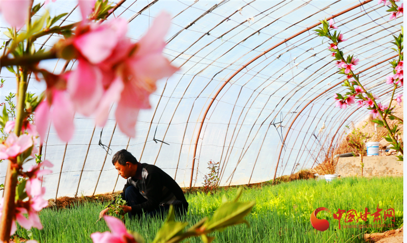 走進(jìn)敦煌市月牙泉鎮(zhèn)現(xiàn)代采摘園區(qū)農(nóng)民陶寶憲的溫室大棚,粉紅的桃花開得正艷,濃濃春意撲面而來,在花香的陪伴下,陶寶憲在大棚中辛勤勞作。