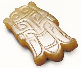 甘肅正寧縣湫頭鄉(xiāng)西侯郎出土的一件漢代豬形玉握,高2.9厘米,長(zhǎng)12.1厘米,寬2.4厘米。呈平臥圓柱形,四肢屈于身下。玉豬雄渾博大,用自然豪放的“漢八刀”技法雕出,刻線(xiàn)為一面坡形。可能是墓主人生前喜愛(ài)的握玉,死后隨葬。