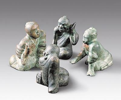 20世紀(jì)90年代甘肅靈臺(tái)縣出土了一組西漢銅質(zhì)博戲俑。俑最高9.2厘米,最寬9.7厘米。四俑相向跪坐,身著高領(lǐng)長(zhǎng)服。其中二人頭挽發(fā)髻,二人以寬巾裹頭。坐姿不同,形態(tài)各異,有的前傾仰首,有的垂臂塌肩;有的袒胸露膊,似在伸手探??;有的屈腿斜身,默然扶膝靜坐。四俑的面部表情不同,刻畫(huà)細(xì)膩。他們或喜笑顏開(kāi),或嚴(yán)肅面對(duì),或凝神沉思,或略顯悲愁,神態(tài)活現(xiàn),精彩逼真,具有高超的藝術(shù)性和研究?jī)r(jià)值。