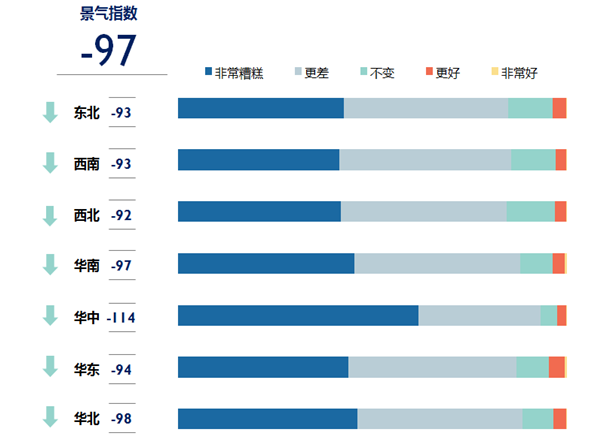 《報告》稱,受疫情影響,全國各地對于旅游到訪目的地的景氣預期同樣極度消極,7大地區(qū)市場的平均景氣指數(shù)跌至-97。其中,受疫情影響最為嚴重的華中地區(qū)景氣指數(shù)最低。同樣的,目的地景氣指數(shù)也表現(xiàn)出疫情影響越嚴重,指數(shù)表現(xiàn)越低的趨勢。
