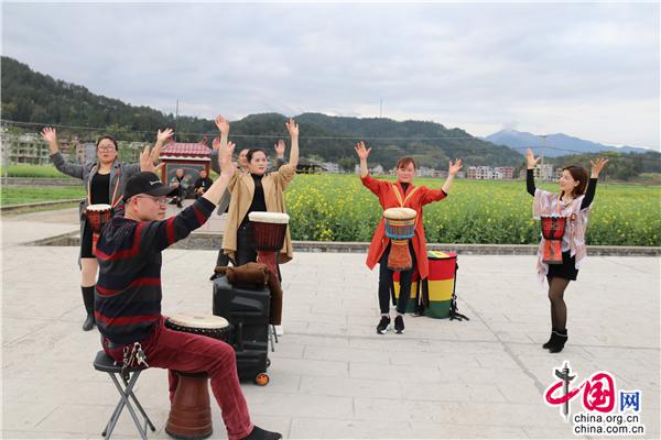 3月22日中午,湖南省隆回縣司門前鎮(zhèn)學(xué)堂灣村,文化志愿者教村民打手鼓、跳舞,吸引一旁踏青的游客前來觀摩。