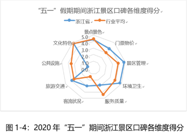 浙江景區(qū)在景區(qū)管理(口碑得分 4.8 分)、門票物價(口碑得分3.8分)、環(huán)境衛(wèi)生(口碑得分4.7分)表現(xiàn)較好,領(lǐng)先行業(yè)平均水平,但在交通、服務(wù)方面低于行業(yè)平均水平。