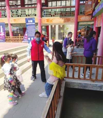 志愿者們不懼烈日,在古鎮(zhèn)開展文明勸導工作。當游客走累了,靠在欄桿處休息時,志愿者立即走過去耐心勸導游客,說明此處危險,并向游客指明休息場所;當有游客爬到景區(qū)禁止攀爬的設施上照相時,志愿者們耐心勸導,引導游客文明照相。在閑暇之余,志愿者還要在古鎮(zhèn)內(nèi)撿煙頭、撿落地垃圾等。
