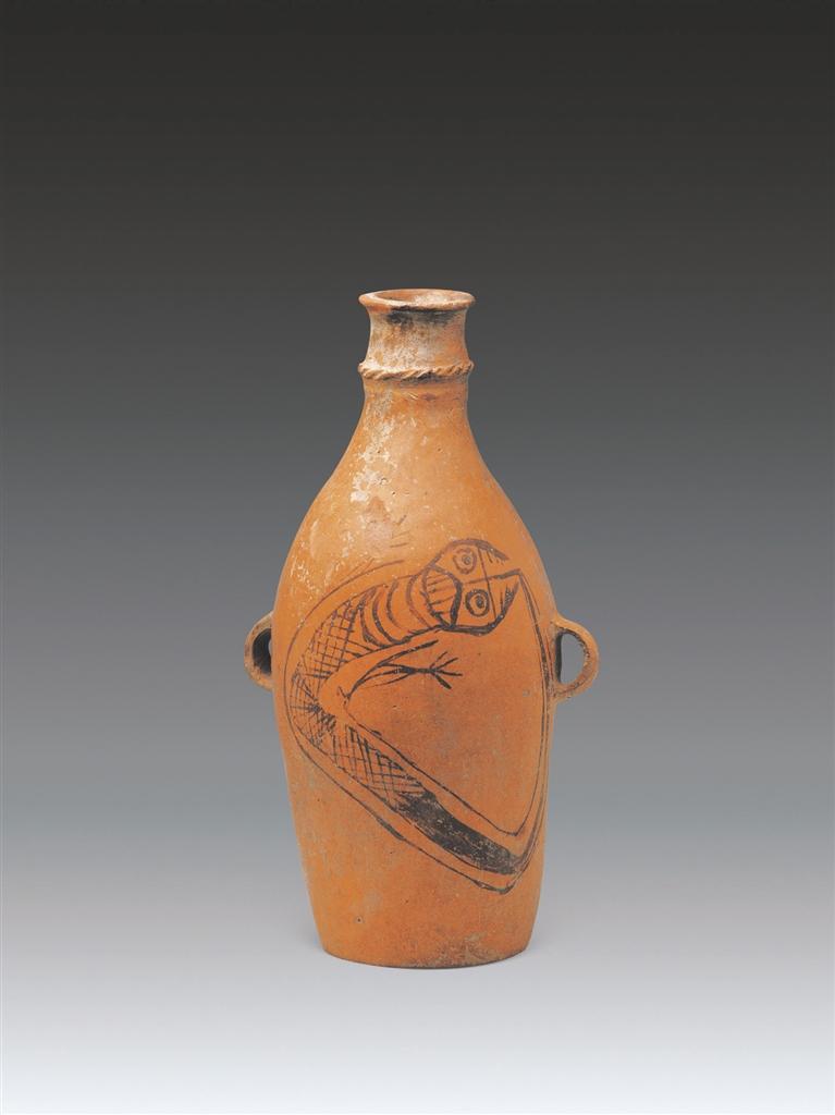 “鯢魚紋彩陶瓶”(距今約 5200 年),這是只工藝非常精美的彩陶瓶,式樣與后世的瓶一般無二了。更令人贊嘆的是勻稱凈美的瓶身上繪的一只娃娃魚,也就是學(xué)名鯢魚的彩繪! 這只娃娃魚雙目圓睜,大口露牙,長條曲折狀身軀,首尾相接,兩側(cè)飾爪形紋。彩陶瓶上的娃娃魚圖案繪得如此生動(dòng)傳神,給這件精美的彩陶瓶平添了許多神秘意境和藝術(shù)魅力。