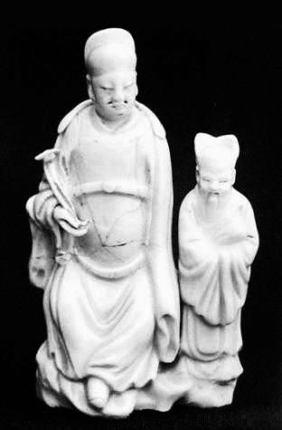 這件白瓷供養(yǎng)人像,為德化瓷人物像,釉面為純白色,色澤光潤明亮。整件雕塑由兩個人物構(gòu)成,一大一小,一主一副。主像高13.7厘米,身穿典型的明代服飾,人物端坐在山石上,衣著瀟灑,神態(tài)自然從容,盡顯雍容華貴,而手執(zhí)如意則似乎暗示著他內(nèi)心的向往和追求。整個構(gòu)圖自然放松,給人一種輕松的感覺。小人物則是長髯飄灑,笑容和藹可親,似乎帶著點(diǎn)職業(yè)習(xí)慣的微笑,雖然年紀(jì)比較大,但卻處于仆從的位置,手里還抱著一卷書。從一個側(cè)面烘托出了年輕主人的身份。