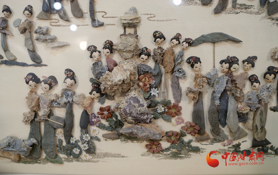最近,周文露正在創(chuàng)作客戶(hù)定制的金陵十二釵圖,這幅風(fēng)雨雕除了人物面部經(jīng)過(guò)人為描繪加工,其他部位以及山水意境等都是戈壁沙石所做。很大程度上,這幅作品就是巧妙地將戈壁沙石創(chuàng)意堆砌達(dá)到畫(huà)面效果。