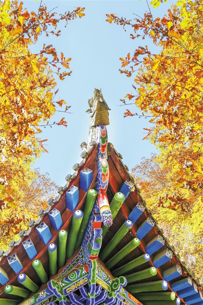 在秋天,興隆山不只有紅葉,與青岡樹相伴的還有山楊落葉松和樺樹,它們的枝頭像棲滿了黃蝶。一片片野山楊,在初陽的照耀下,純粹的本色的黃,如波浪流動(dòng),漫過一道道山脊,充盈一處處山彎。一片片白樺林,也是那么衷情,帶些褐色的黃在蒼翠的松柏云杉間,同掩映在峰巒間寺院道觀的翹角飛檐色調(diào)完全一致,格外讓人留戀。
