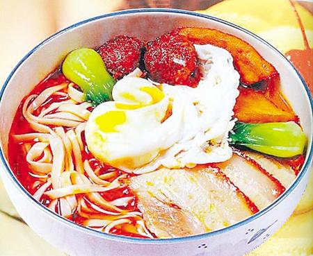 其實,桃花面指的不是面條,而是面條的配料,亦如我們的“牛肉面”“臊子面”中的“牛肉”和“臊子”。不同于“牛肉”和“臊子”的是,桃花面中的“桃花”亦不是枝頭的那片美艷,而是擺在碗中面條上的一片誘人口水的燒肉、一個金黃的丸子、一個白白嫩嫩的荷包蛋外加幾根青翠怡人的菠菜。在碗口這個不大的天地間,綠的是新芽,黃的如花蕊,相間在紅肉白蛋里,自然有了桃花的寫意,故名“桃花面”。