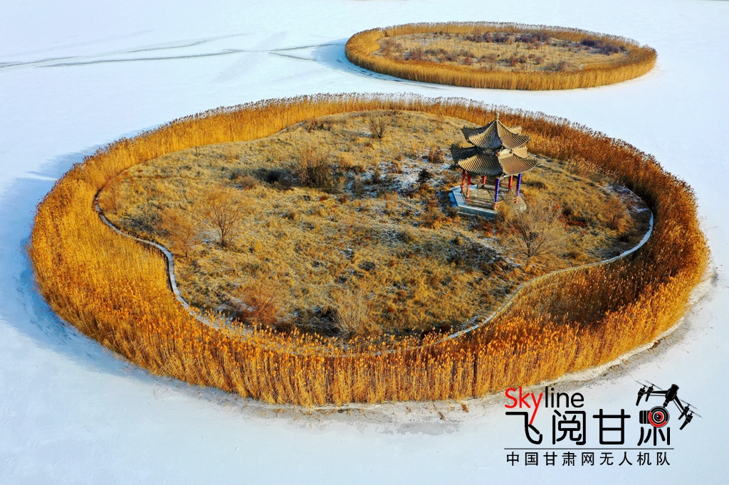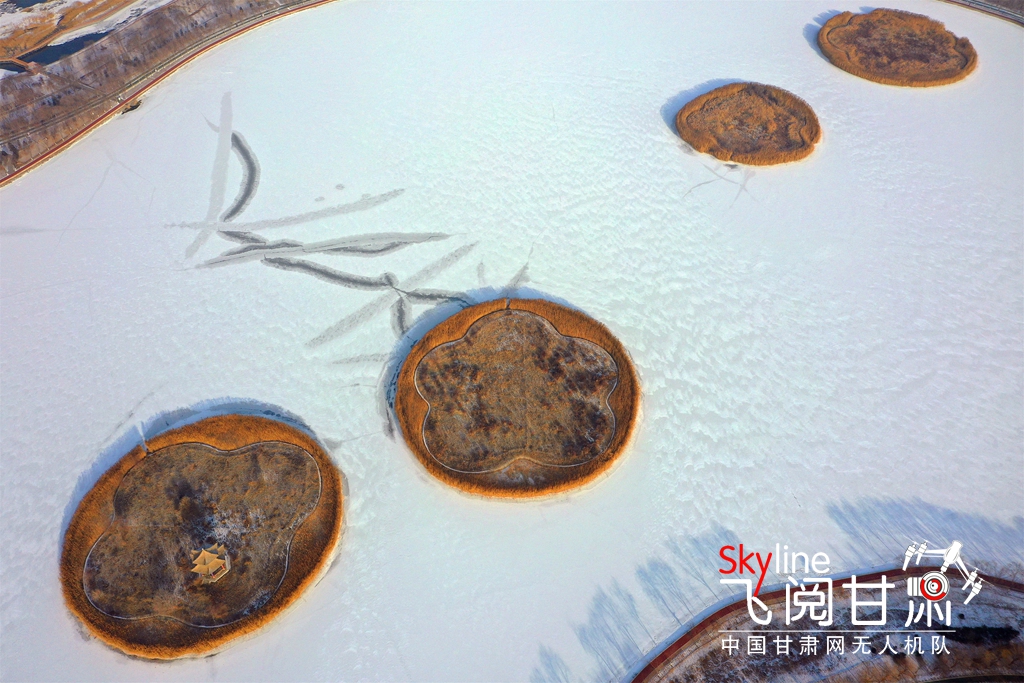12月13日,甘肅省張掖潤泉湖公園在冰面白雪映襯下,美如畫卷,別有一番意境。
