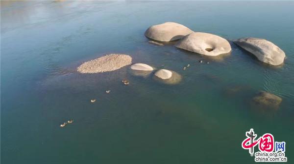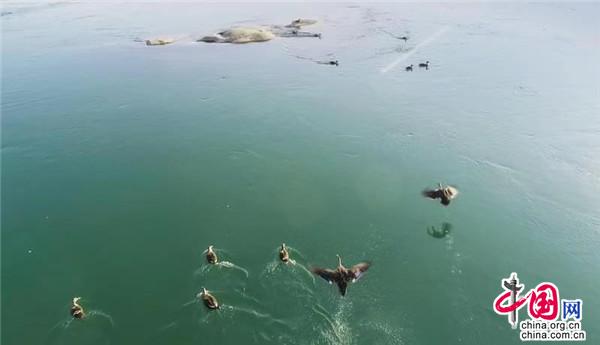 1月12日,在湖南桃江羞女湖國家濕地公園當地攝影家協(xié)會成員用無人機有幸拍到一群正在資江戲水的野生保護物種——斑嘴鴨。