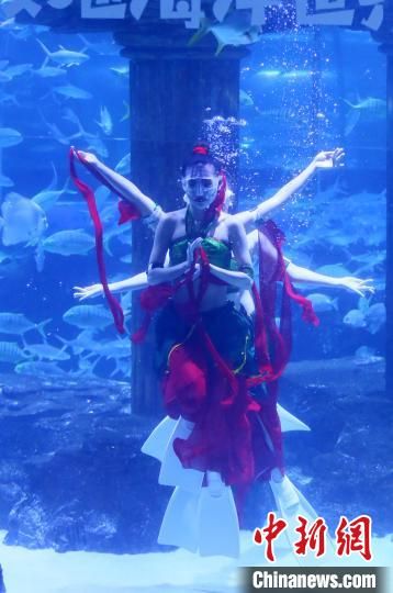 身著綠衣紅褲的飛天舞蹈服、腳穿雙蹼,在5米多深的人造海水中與海洋精靈共舞,在蘭州極地海洋世界,三位“美人魚”表演“海底飛天”,吸引眾多游客觀看。