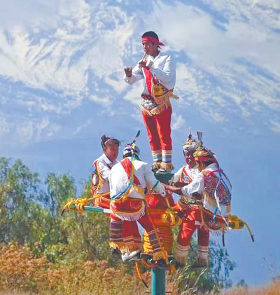 這些舞者表演的是墨西哥傳統(tǒng)的“飛天舞”儀式。“飛天舞”在墨西哥韋拉克魯斯州的托托納克人中盛行,現(xiàn)已成為該州帕潘特拉市代表性的文化標(biāo)志。2009年,這項(xiàng)民間技藝被聯(lián)合國(guó)教科文組織列入人類非物質(zhì)文化遺產(chǎn)代表作名錄。