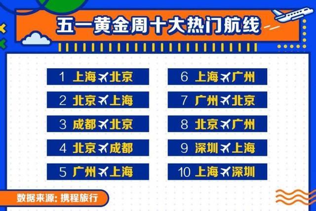 《報(bào)告》稱(chēng),今年五一期間,消費(fèi)者跨省出游意愿強(qiáng)烈,攜程機(jī)票單日訂單量對(duì)比2019年同期最高增幅約28%。上海-北京、北京-上海、成都-北京、北京-成都、廣州-上海、上海-廣州、廣州-北京、北京-廣州、深圳-上海、上海-深圳為“五一”黃金周十大熱門(mén)航線(xiàn)。