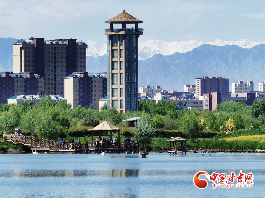 初夏時(shí)節(jié),祁連山下的甘肅省張掖市草木翠綠,湖水蕩漾,在皚皚白雪的映襯下別有一番景色。
