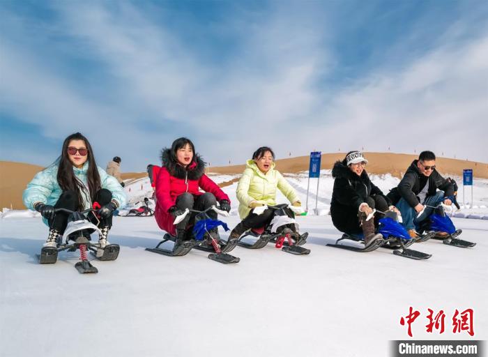 圖為新年伊始,游客在敦煌沙漠露營基地享受滑雪的樂趣。張曉亮 攝