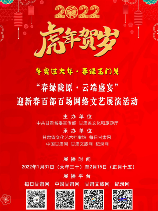 甘肅省博物館在春節(jié)期間舉辦了“虎虎生福——壬寅(虎年)新春生肖文物聯(lián)展”,甘肅省圖書館舉辦7大專題30余項文化體驗活動。在“春之華章”2022年甘肅省電視春節(jié)聯(lián)歡晚會上,原創(chuàng)話劇《八步沙》、隴劇《大禹治水》等精彩上演;甘肅省非遺保護(hù)中心開展了“虎虎有神過大年——如意甘肅·多彩非遺”宣傳推廣活動;甘肅演藝集團(tuán)通過線上線下結(jié)合方式,開展2022“我們的中國夢”——文化進(jìn)萬家迎新春文藝演出活動;張掖市舉辦春節(jié)“九曲黃河燈陣啟燈納福非遺文化展演”活動。