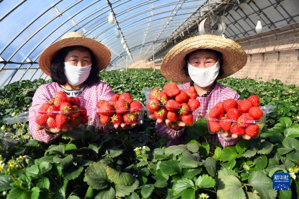 2月20日,工作人員在北京百旺農(nóng)業(yè)種植園草莓種植大棚采摘草莓。