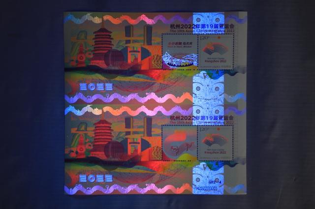 據了解,《杭州2022年第19屆亞運會》特殊版式個性化郵票雙連張是中國集郵有限公司匠心打造的首款GPZ編號體育題材郵票,由青年設計師趙郁竹擔綱設計,限量發(fā)行。它依托杭州亞運會色彩系統(tǒng)和視覺形象元素,融歷史文化、現代美學和未來暢想于一體,集藝術感、科技感和運動感于一身,展現中華文明、浙江風采、杭州韻味和時代魅力,采用特殊版式、編號和工藝,紫光燈下局部呈現無色熒光油墨圖案和全真彩效果,傳遞中國郵政對杭州亞運的美好祝福。(圖片由人民日報客戶端提供)