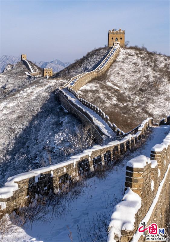 皚皚白雪覆蓋長城內(nèi)外,銀裝素裹金山嶺氣勢磅礴。