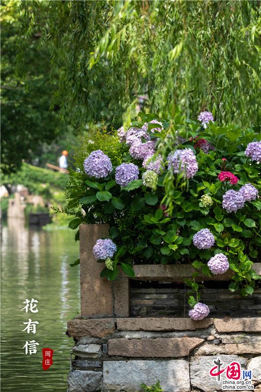 花團錦簇一詞大約是為繡球量身定制,微風一曳,波光親吻一曳。藍紫開遍,彌漫的淡淡花香讓春天的信使忍不住沉溺其中,周莊的浪漫大抵關乎世間一切。